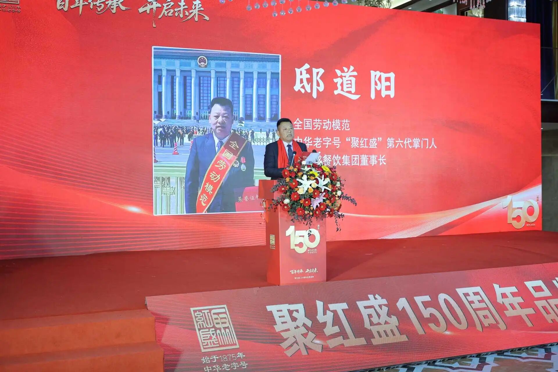 全国劳模、聚红盛第六代掌门人、聚红盛餐饮集团董事长邸道阳发表了热情洋溢的致辞。他表示,聚红盛始终以“诚、信、义” 为血脉,秉持 “传承不守旧,创新不忘本” 理念,从寿州酒馆发展成为辐射全省多地的连锁餐饮品牌。这份成长,离不开社会各界的厚爱与支持,更感恩商会一路相伴,让我们在传承匠心的道路上有了更坚实的后盾。站在 150 周年的新起点,聚红盛将继续怀揣 “铸传世品牌” 的愿景,在传承中守正,让 “寿州老味道” 代代相传。
